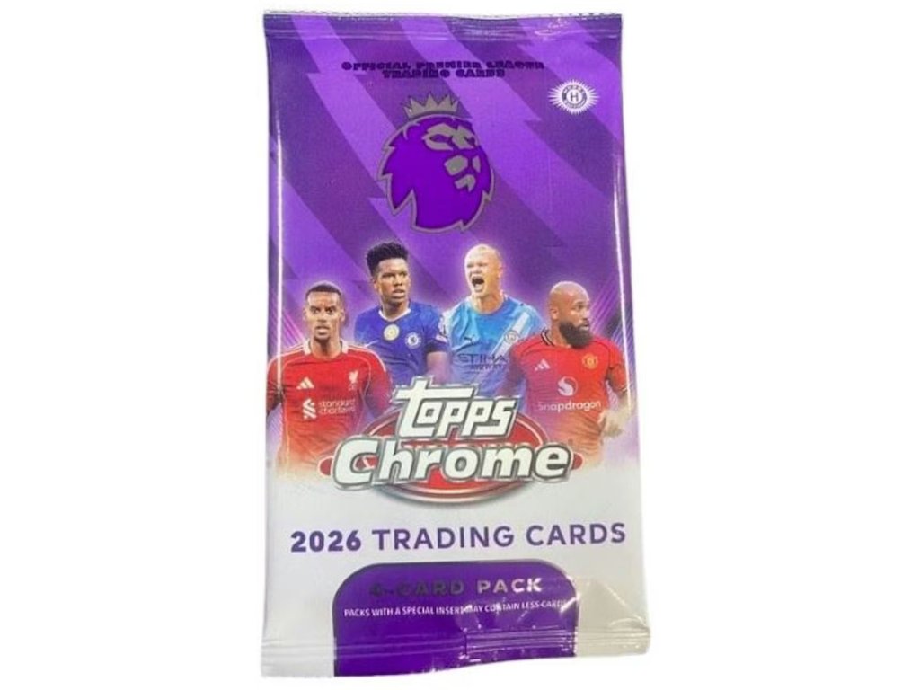 Samostatný balíček z ikonickej série Topps Chrome Premier League 2026 prináša lesklý chrome dizajn a hviezdy najlepšej futbalovej ligy sveta v kompaktnom formáte.