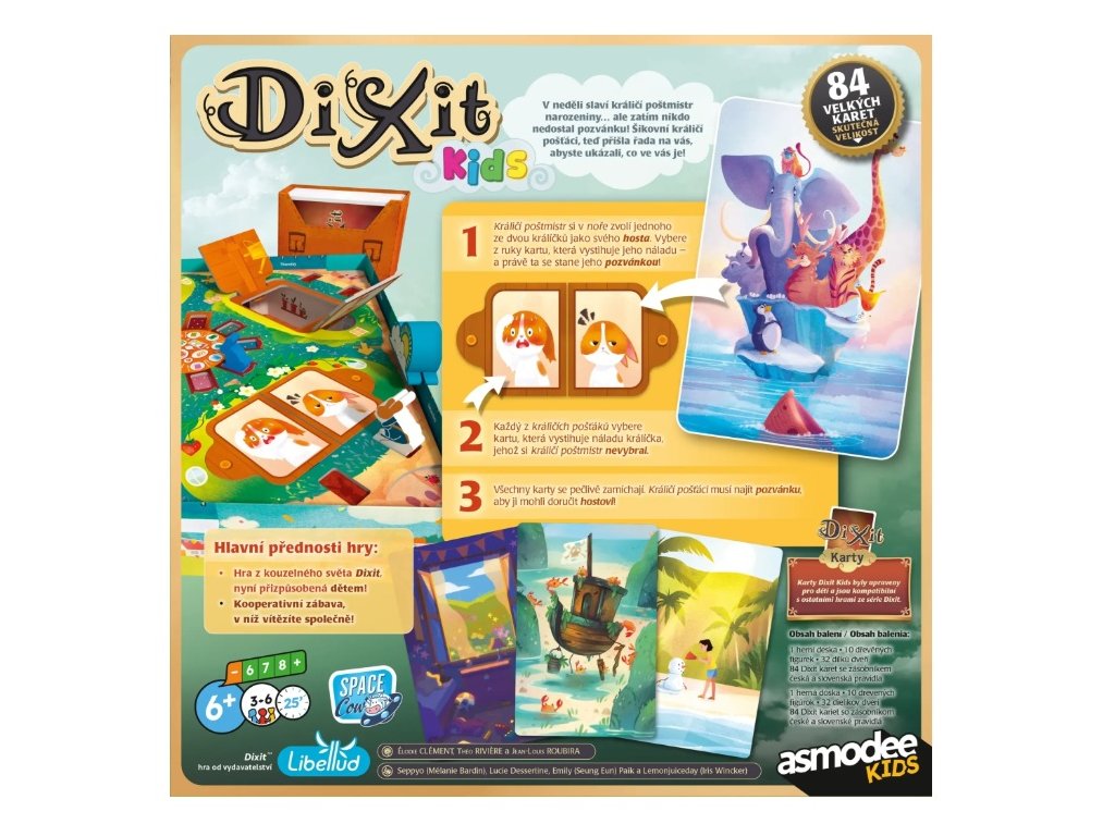 Dixit Kids prenáša detskú fantáziu do sveta veselých králikov pripravujúcich sa na narodeninovú oslavu. Hráči spoločne hľadajú správne pozvánky, vyberajú ilustrácie podľa nálady králikov a krok za krokom rozsviecujú atmosféru blížiacej sa oslavy. Hra rozvíja schopnosť opisovať, vnímať detaily a spolupracovať v priateľskom, kooperatívnom prostredí.