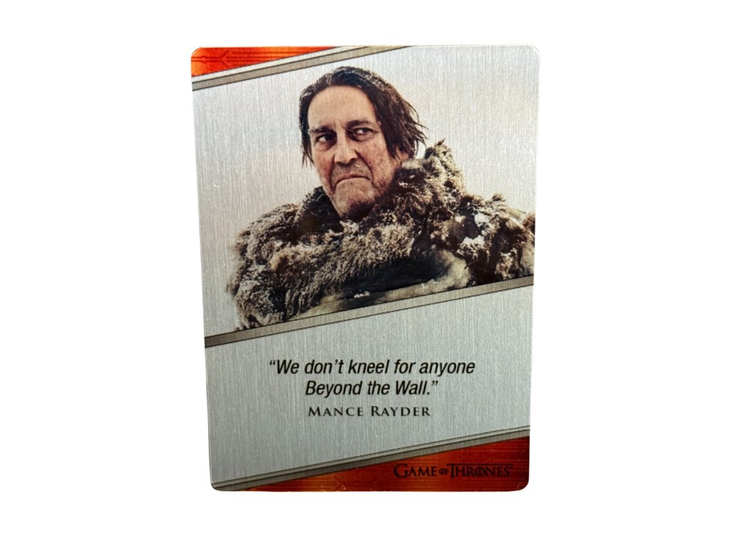 A powerful metal character card featuring Ciarán Hinds as the legendary Mance Rayder, King-Beyond-the-Wall from Game of Thrones.
