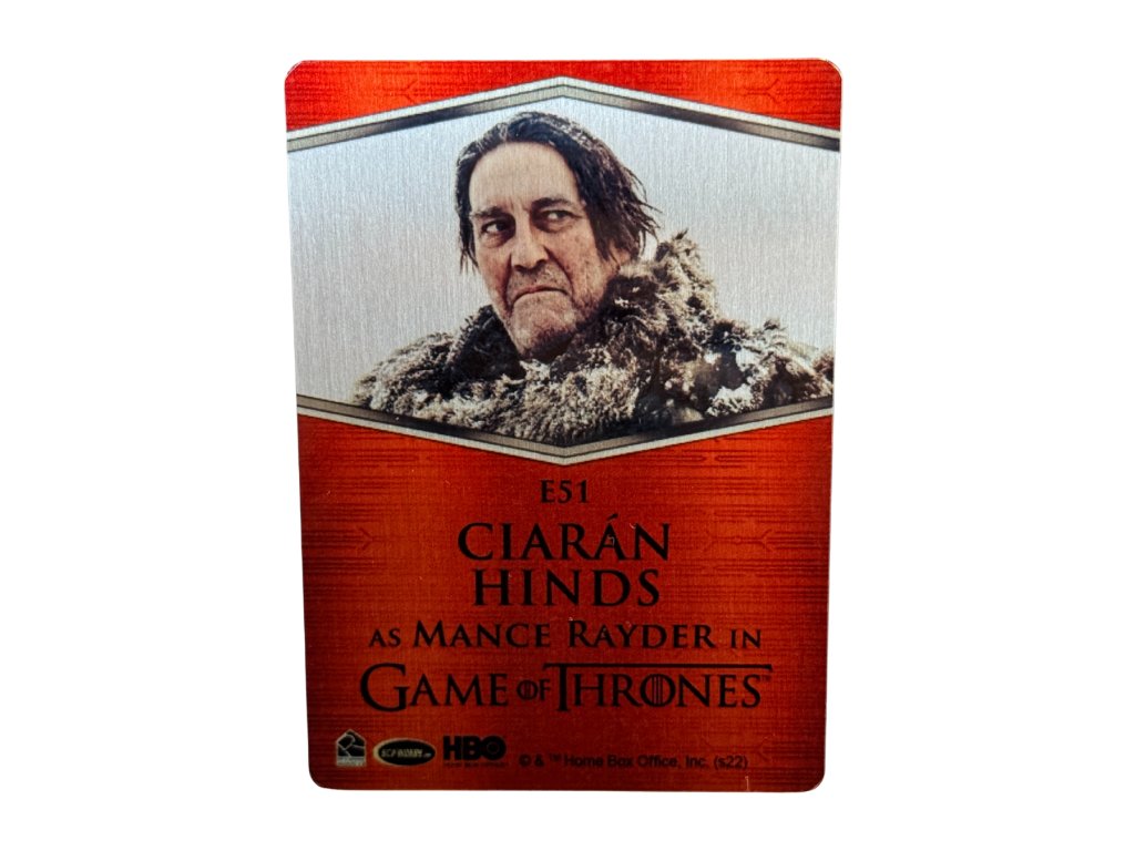 Card #E51 carries a calm authority and rugged presence, struck on true metal stock that gives the card real gravitas. Mance Rayder is a lore-heavy, leader-type character, making this insert a favorite among collectors who value narrative importance over pure screen-time hype.