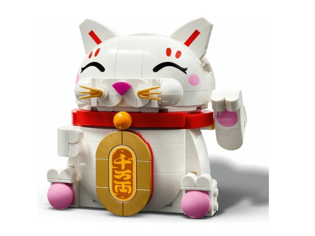 Decorative LEGO® Lucky Cat building set with a waving paw, symbolizing prosperity and good fortune.