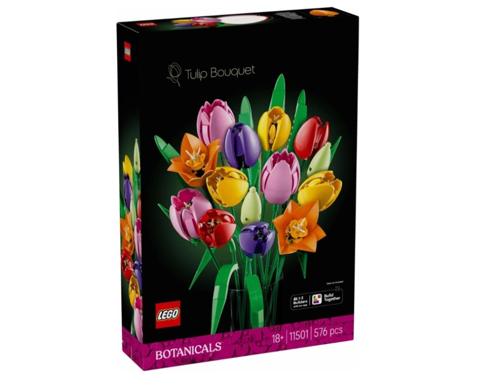 LEGO® Botanicals Tulip Bouquet (11501) – 576 pieces for adults, 5 tulips in various colors and bloom stages, adjustable stems and realistic leaves.