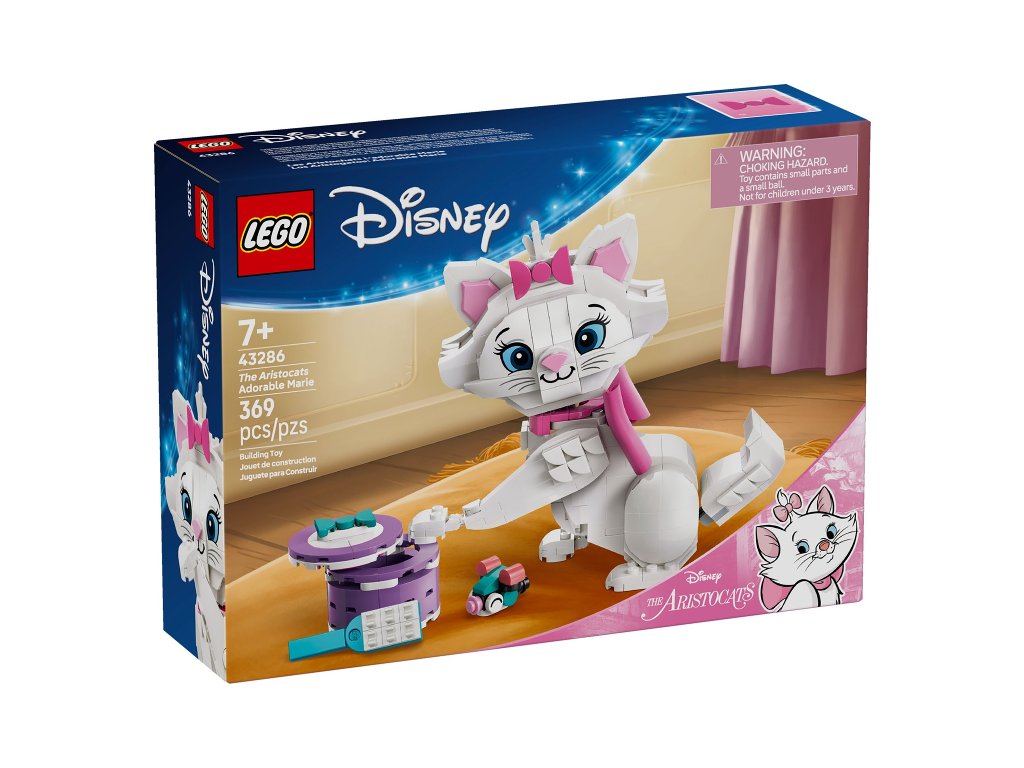 LEGO® Disney 43286 The Aristocats Adorable Marie is an officially licensed building set with 369 pieces, featuring a posable figure of Marie the kitten from the classic Disney movie The Aristocats, with a bendable head, paws, tail and ears, and includes accessories such as a purple gift box with a removable lid, a small brick mouse, a blue brush, a fish and a pink fabric bow; this versatile model is ideal for creative play, imagination development and storytelling for children aged 7 and up, while also making a beautiful addition to any space as a decoration for fans of Disney and the LEGO® Disney collection.