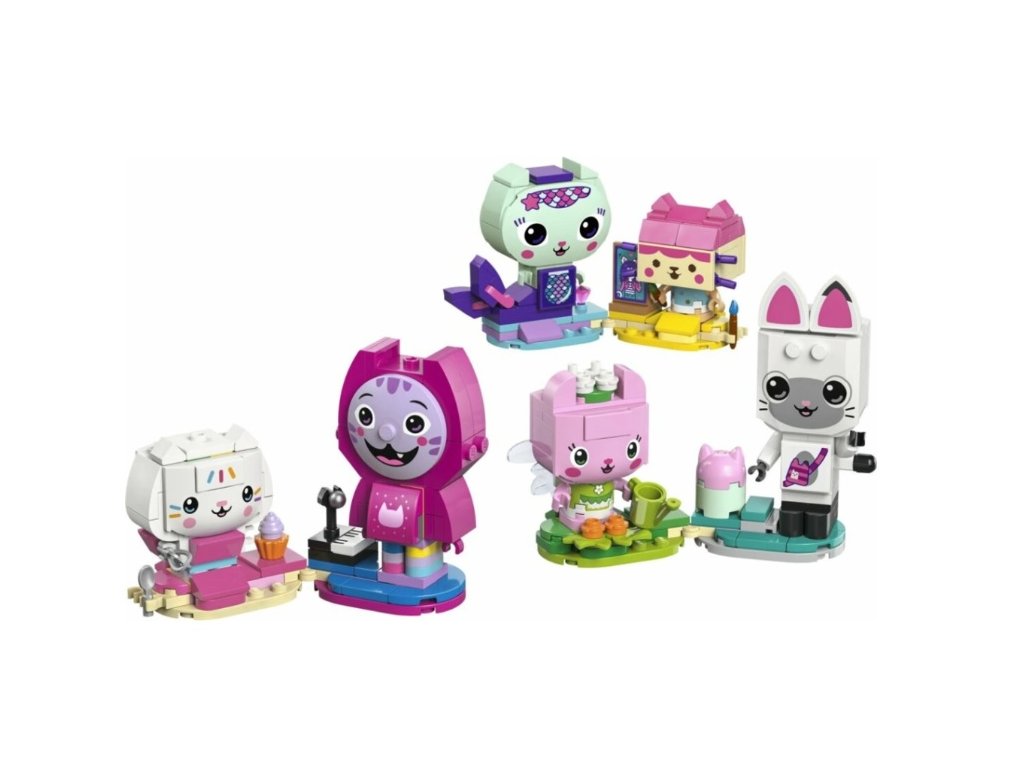 6 animal minifigures: Sirena with gem, Tiny Box with Gabi’s picture, Fairy Cat with canvas, Pandi Friend with house, Cookie with cake, DJ Catman with piano.