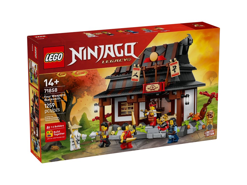 LEGO® NINJAGO® 71858 Four Weapons Blacksmith delivers exciting ninja adventures in the weapons master’s workshop. Minifigures and interactive features allow creative and action-packed play.