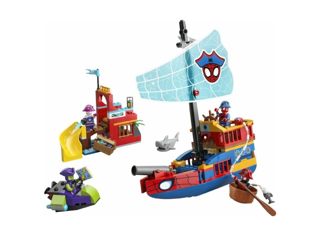 Superhero pirate ship: Webs Ahoy pirate ship, Spider Island, Green Goblin’s ship, and small boat for endless adventures.