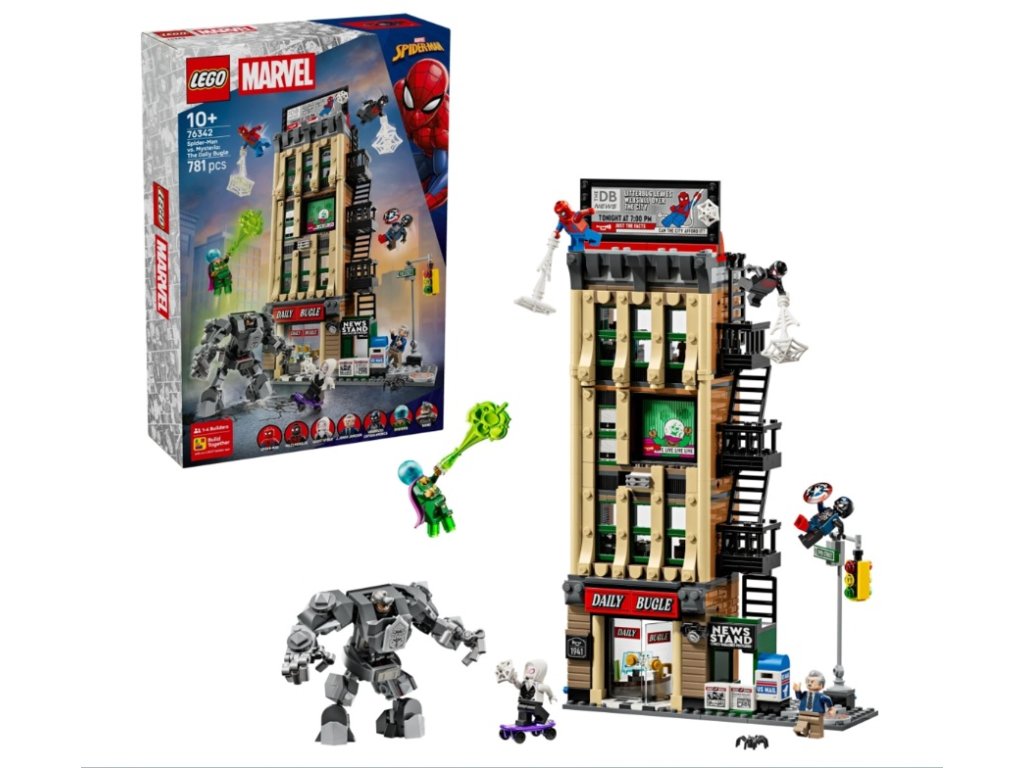 The set includes 7 minifigures: Spider-Man, Miles Morales, Ghost-Spider, J. Jonah Jameson, Mysterio, Venomized Captain America and Rhino, plus a poseable Rhino mech with an opening cockpit. With web elements, transparent action pieces, a changing billboard, offices, a vault and street details, this 781-piece set delivers an immersive build-and-play experience and makes a perfect gift for Marvel fans.