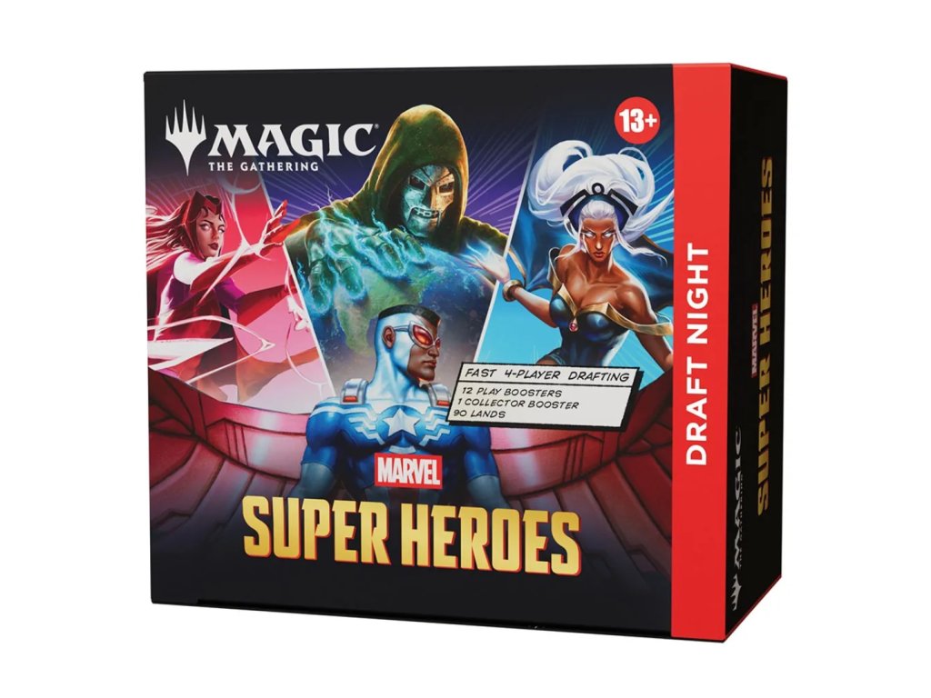 Marvel Super Heroes Draft Night is a complete draft party in a box with Play Boosters, a Collector Booster prize, and lands for an unforgettable Pick-Two Draft game night.