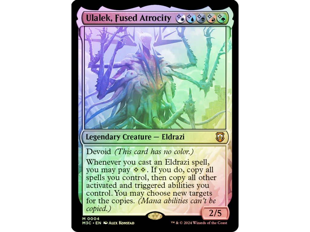The best choice for this deck's Commander is Ulalek, Fused Atrocity. With this Commander, whenever you cast an Eldrazi spell, you can pay two colorless mana to copy all of your active spells and abilities. You can choose new targets for them, and you are not limited to copying just Eldrazi spells.
