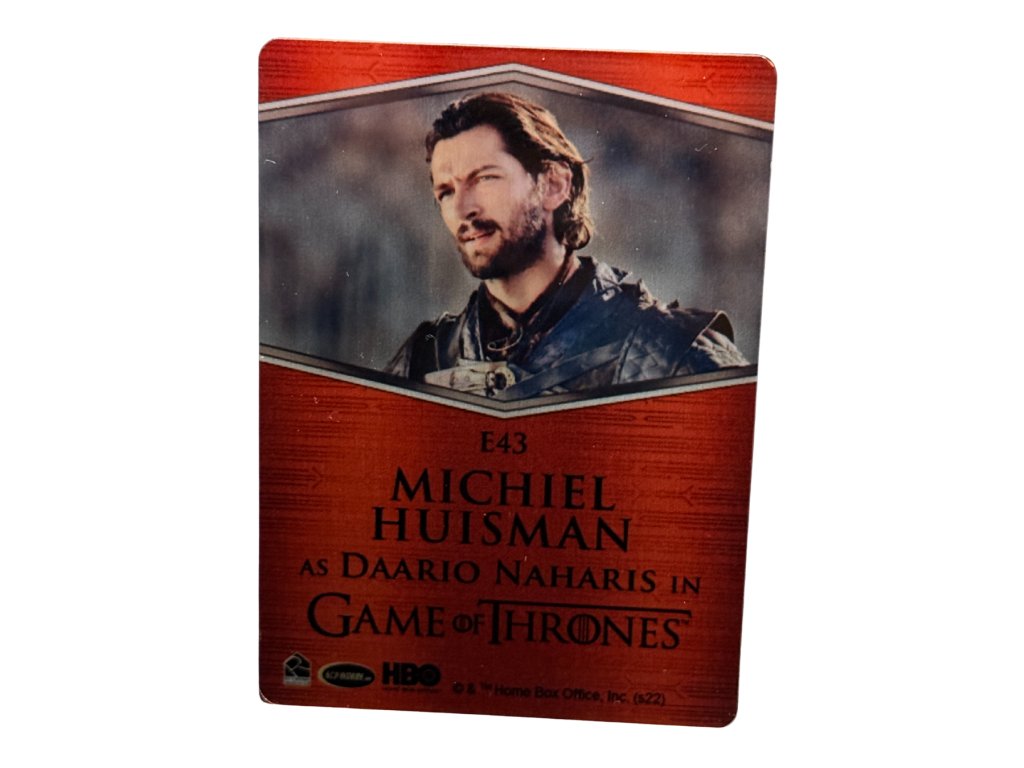 Card #E43 brings swagger and attitude, struck on true metal stock that enhances Daario’s rogue appeal. As a key figure in Daenerys’ Essos arc and a polarizing fan character, this insert holds strong value for collectors building Daenerys-themed or Essos-focused E-Series runs.
