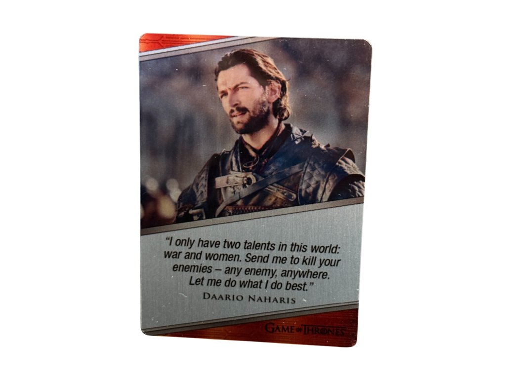 A bold metal character card featuring Michiel Huisman as the charismatic sellsword Daario Naharis from Game of Thrones.
