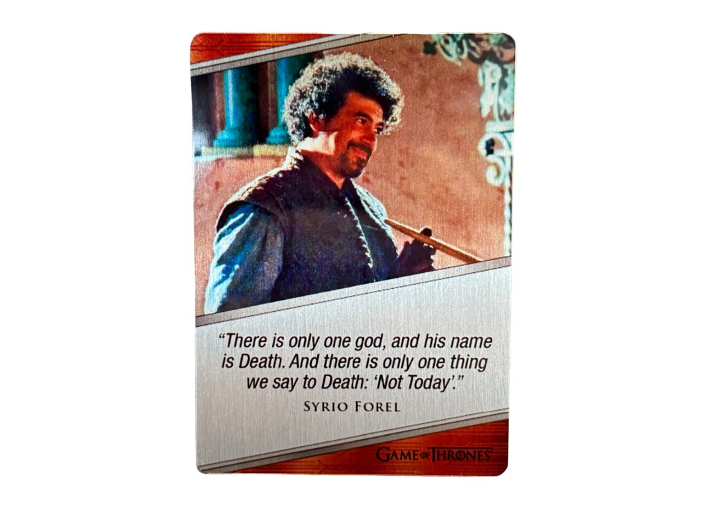 A highly respected metal character card featuring Miltos Yerolemou as the legendary swordsman Syrio Forel from Game of Thrones.