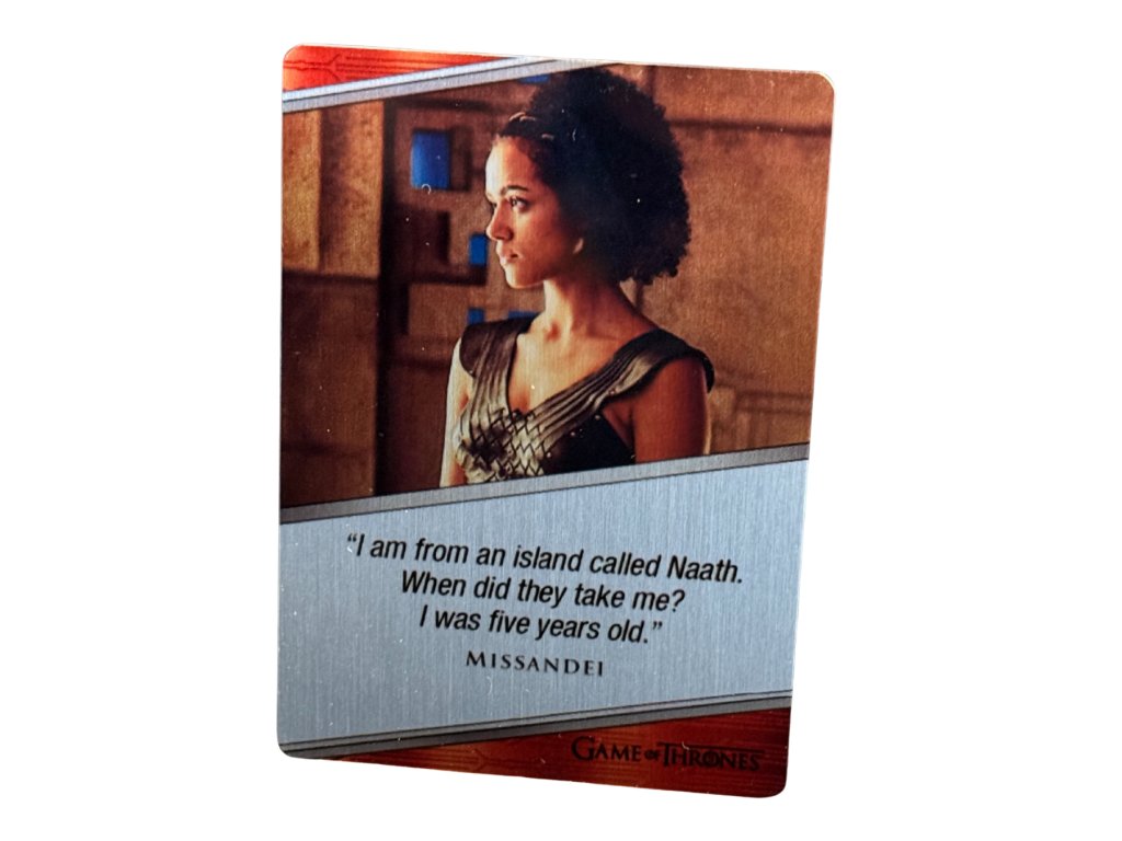 An elegant metal character card featuring Nathalie Emmanuel as the devoted and intelligent Missandei from Game of Thrones.
