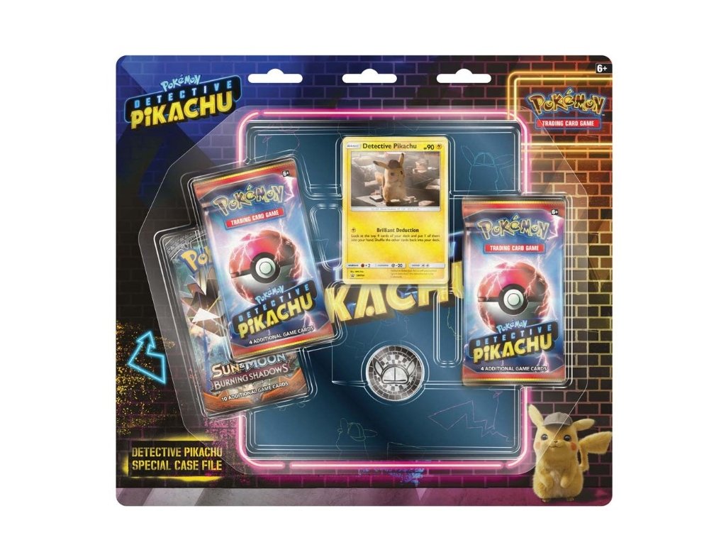 This collector’s set includes a promo Detective Pikachu card, a metal coin, 2 Detective Pikachu boosters, an additional Pokémon TCG booster, a themed 4-pocket binder, and a code card for Pokémon TCG Online.