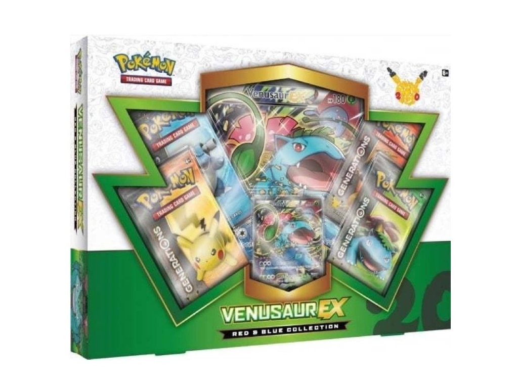 Celebrate 20 years of Pokémon with the Red & Blue Collection – Venusaur-EX, a tribute to one of the original Pokémon icons. Venusaur, a cornerstone of the Kanto region, is featured as a powerful Venusaur-EX promo card alongside a beautifully sculpted collectible figure.