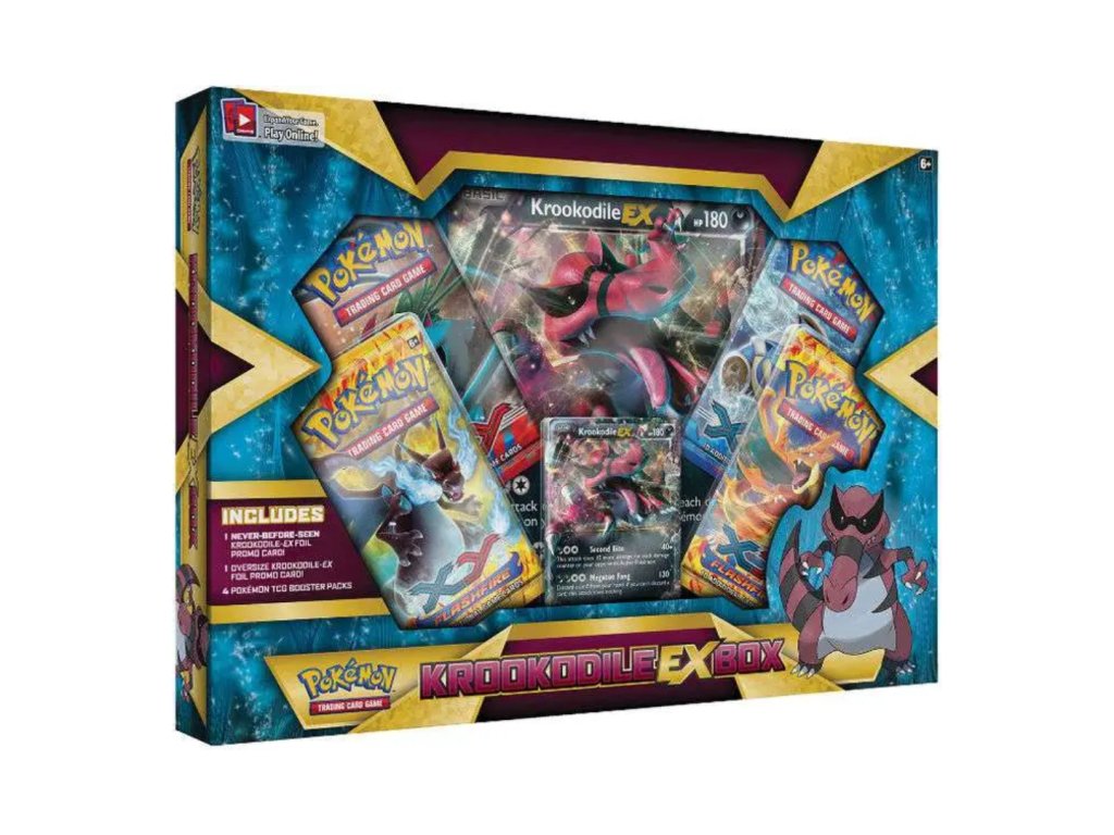 The Pokémon TCG: Krookodile-EX Box 2014 is a collectible TCG box from the XY – Flashfire series featuring a foil Krookodile-EX promo card. It also includes an oversize (jumbo) Krookodile-EX card, 4 Pokémon booster packs, and a code card for Pokémon TCG Online. This retro 2014 box is a great addition to any Pokémon card collection or gift for fans of classic TCG products.