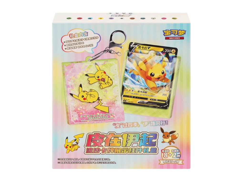 The Pokémon Quicksand – Card Display Gift Box is an official Pokémon China release that blends artistic design with gameplay. Its highlight is the sand-flow display, where colored sand moves to create a dynamic visual effect alongside Pokémon artwork. There are 10 possible versions, including 2 secret editions (Pikachu VMAX and Eevee VMAX).