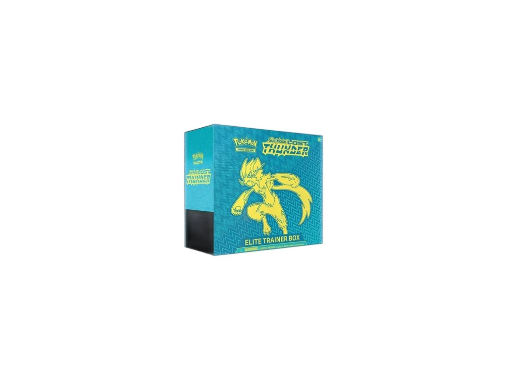 Pokémon TCG: Sun & Moon – Lost Thunder Elite Trainer Box is a complete set for players and collectors, featuring booster packs, accessories, and a Zeraora-themed design.