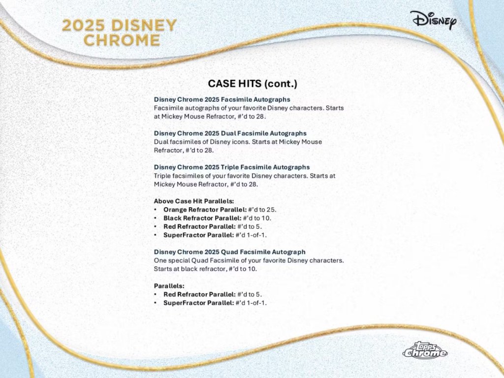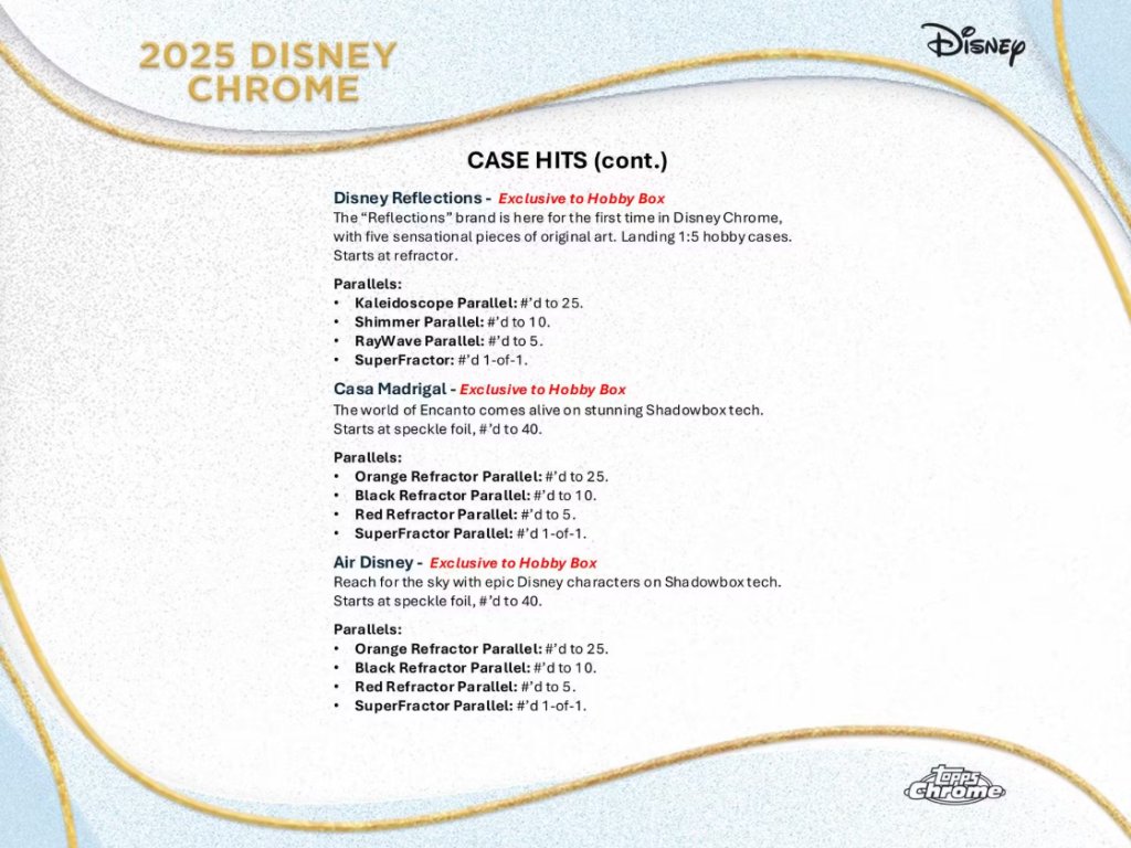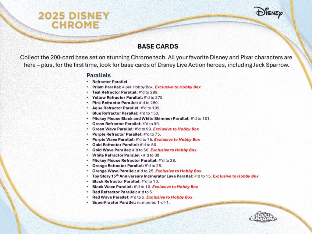The Hobby Booster Pack contains 6 cards from the 2025 Disney Chrome series. Packs may include parallels, themed inserts, autograph, or sketch cards.