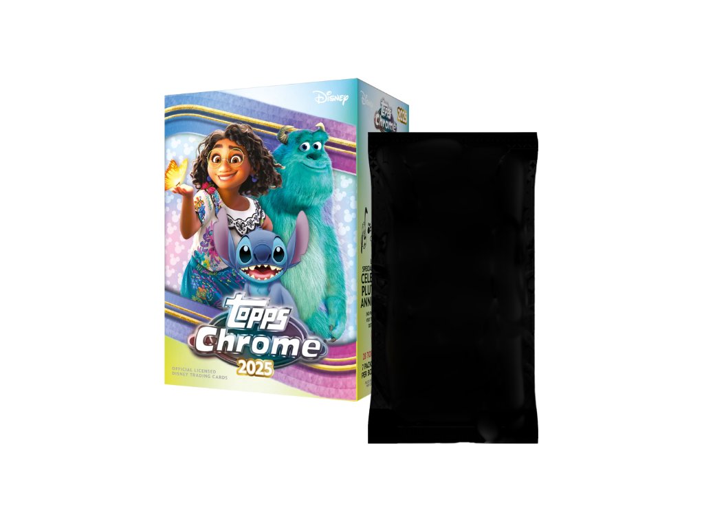 The Value Booster Pack includes 4 cards from the 2025 Topps Chrome® Disney series, with shiny chrome finishes and vibrant designs.