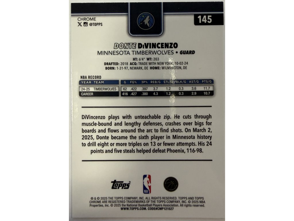 Topps Chrome - Donte DiVincenzo - Limit 045/275 - Raywave