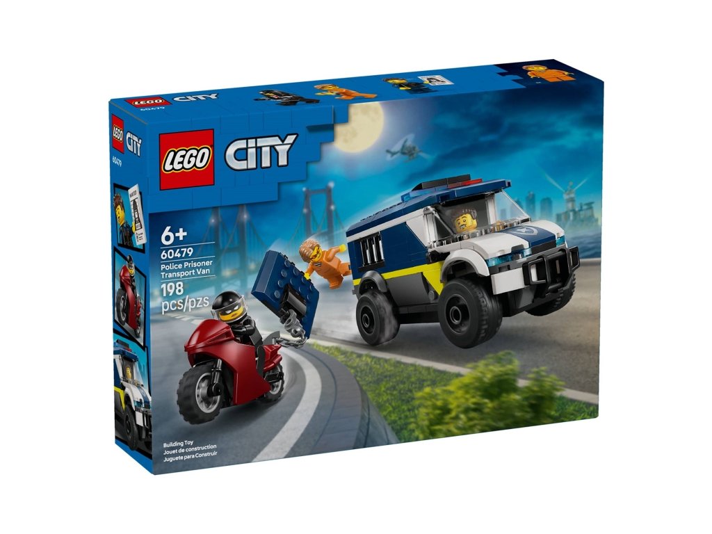 LEGO® City 60479 Policajná dodávka na prevoz väzňov je oficiálne licencovaný stavebný set určený pre deti od 6 rokov, ktorý obsahuje 198 dielikov, realistický model policajnej dodávky so šoférskou kabínou a bunkou pre dvoch väzňov, motocykel s reťazovým hákom na simulovanie úteku z väzenia a tri minifigúrky – policajta a dvoch zloduchov – spolu s doplnkami ako putá a plagát hľadaných, poskytuje napínavé role-play scenáre, podporuje tvorivú hru a rozprávanie príbehov a je ideálny ako darček pre chlapcov a dievčatá, ktorí milujú LEGO City vozidlá a policejné dobrodružstvá.