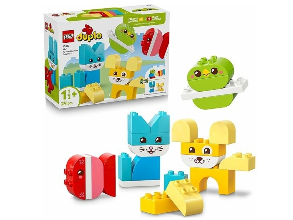 LEGO® DUPLO® Moje prvé kreatívne 3-v-1 domáce zvieratá (10477) – 24 dielikov pre deti od 18 mesiacov, učenie farieb a jemnej motoriky pri stavbe psa, mačky, králika, myši, vtákov a rýb.