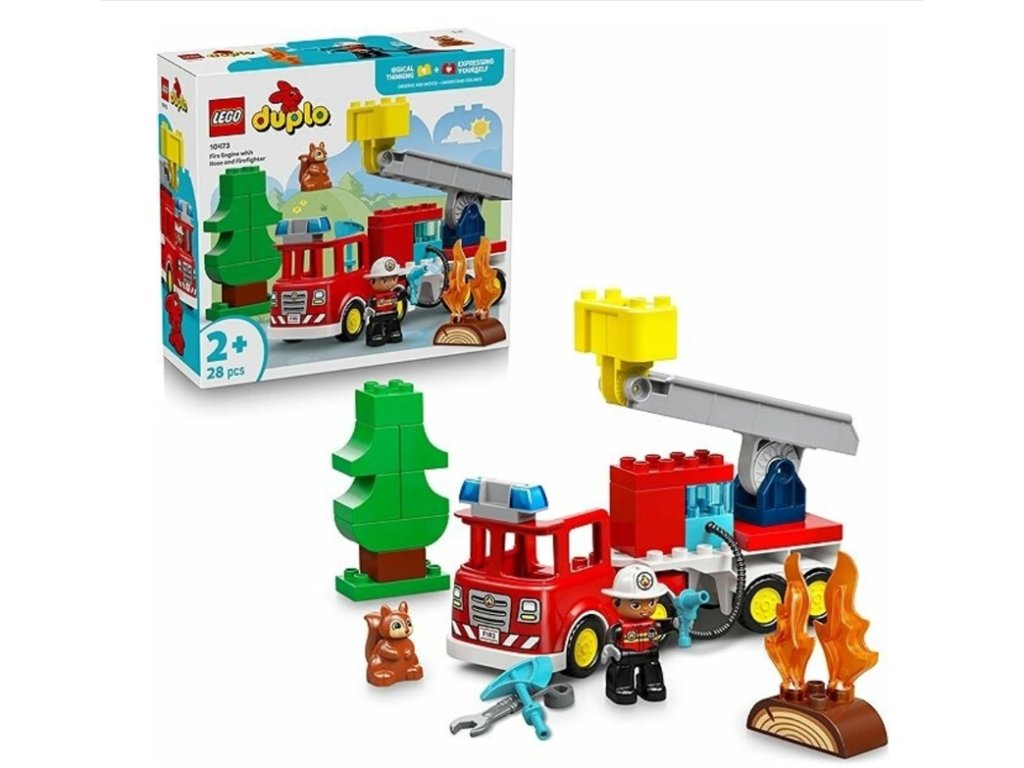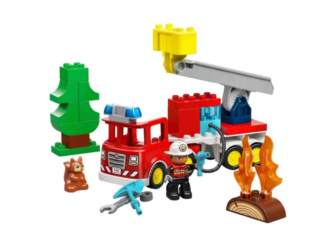 LEGO® DUPLO® Požiarne auto s hadicou a požiarnikom prináša malým deťom od 2 rokov vzrušujúci svet záchranárskych akcií.