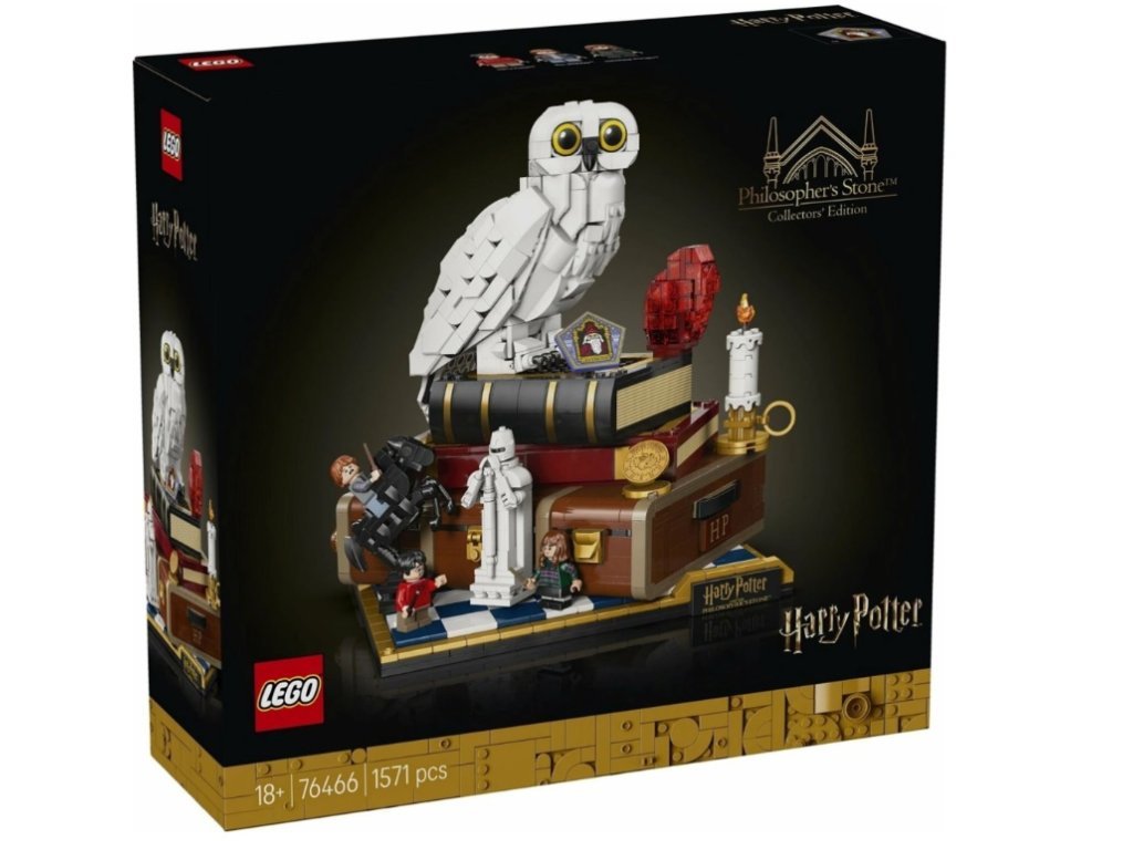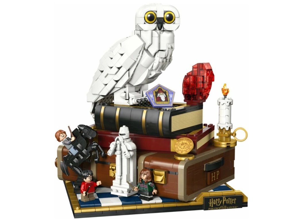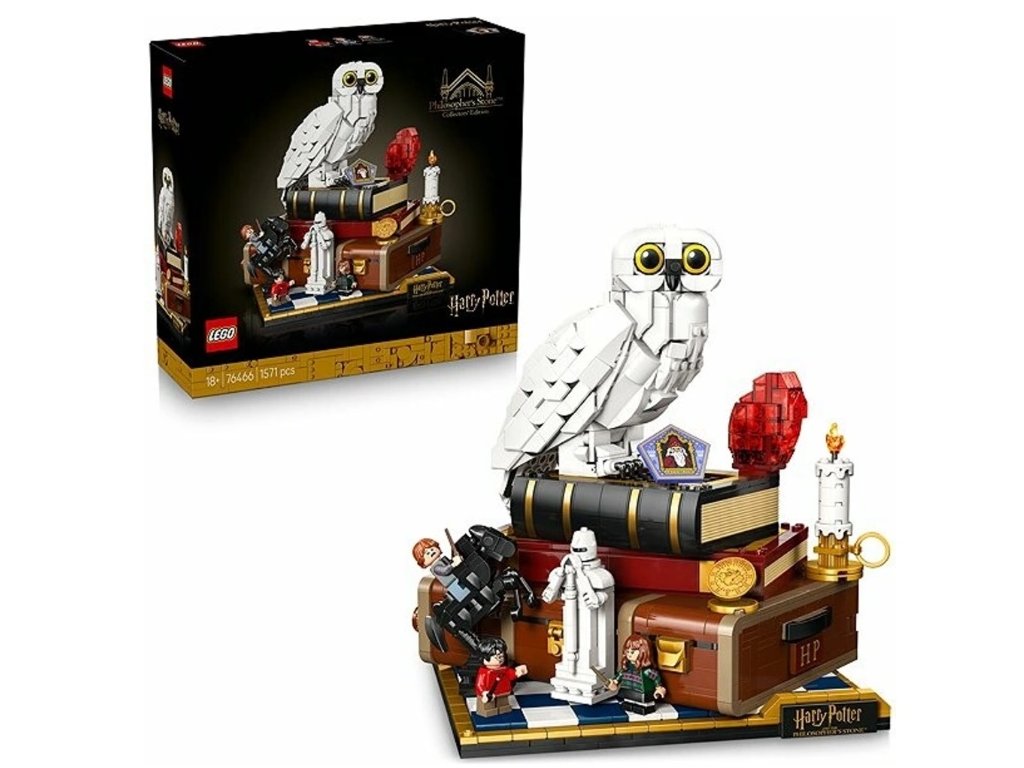 Tento zberateľský model s 1 571 dielikmi zachytáva ikonické postavy, predmety a mikro verzie filmových scén. Postavte si figúrku sovy Hedvigy s elegantne stiahnutými krídlami vedľa Kameňa mudrcov umiestneného na kufri Harryho Pottera a pridajte minifigúrky Harryho Pottera, Hermiony Grangerovej a Rona Weasleyho spolu s doplnkami ako kartička k čokoládovej žabe alebo šachová kráľovná. Pomocou 3 koliesok môžete otáčať Hedvigovou hlavou, posunúť čarodejnícku šachovú figúrku alebo otvoriť časť kufra, aby sa odhalila scéna s horským trolom. Ďalšie mikroskalené scény zobrazujú Rokfortský expres a 5 výziev, ktorým Harry čelí na ceste ku Kameňu mudrcov.