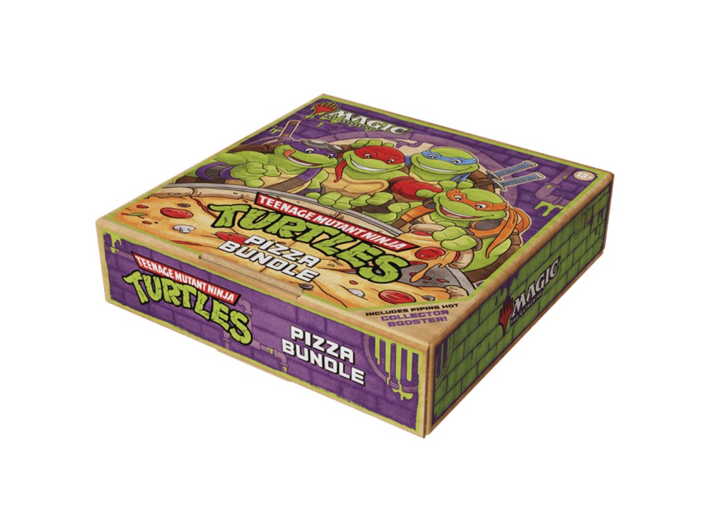 Po otvorení krabice na vás čaká deväť „turtle-tastických“ Play Booster balíčkov, 25 základných landov, nadrozmerná Spindown™ kocka, full-art pizza základné landy a promo karty klasických Magic kúziel s pizzovou tematikou.