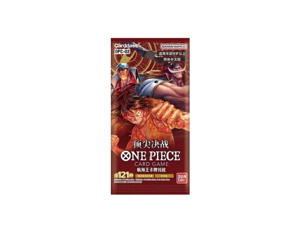 One Piece OP-02 Paramount War Booster Pack – čínska verzia je samostatný booster balíček z druhej edície One Piece Card Game od Bandai. Každý pack obsahuje 12 náhodne zamiešaných kariet, vrátane bežných, vzácnych a potenciálne aj veľmi hodnotných kariet.