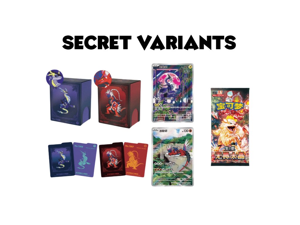 Každá karta má dizajnovo zhodný kovový box na karty s dvomi priehradkami, ako aj magnet, ktorý nesie rovnaký motív. V balení sa nachádza aj jumbo booster pack (20 kariet) zo série Fearless Terastal (CSV3C).