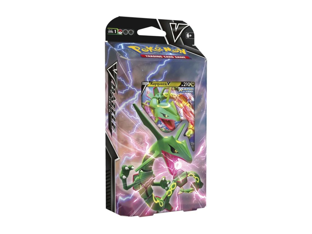 Rayquaza V Battle Deck je predpripravený Pokémon TCG balíček určený na okamžité hranie. Obsahuje Rayquazu V, tréner karty, energie a všetky potrebné herné komponenty, vďaka čomu je vhodný pre nových hráčov, príležitostné súboje aj rozšírenie zbierky kariet.