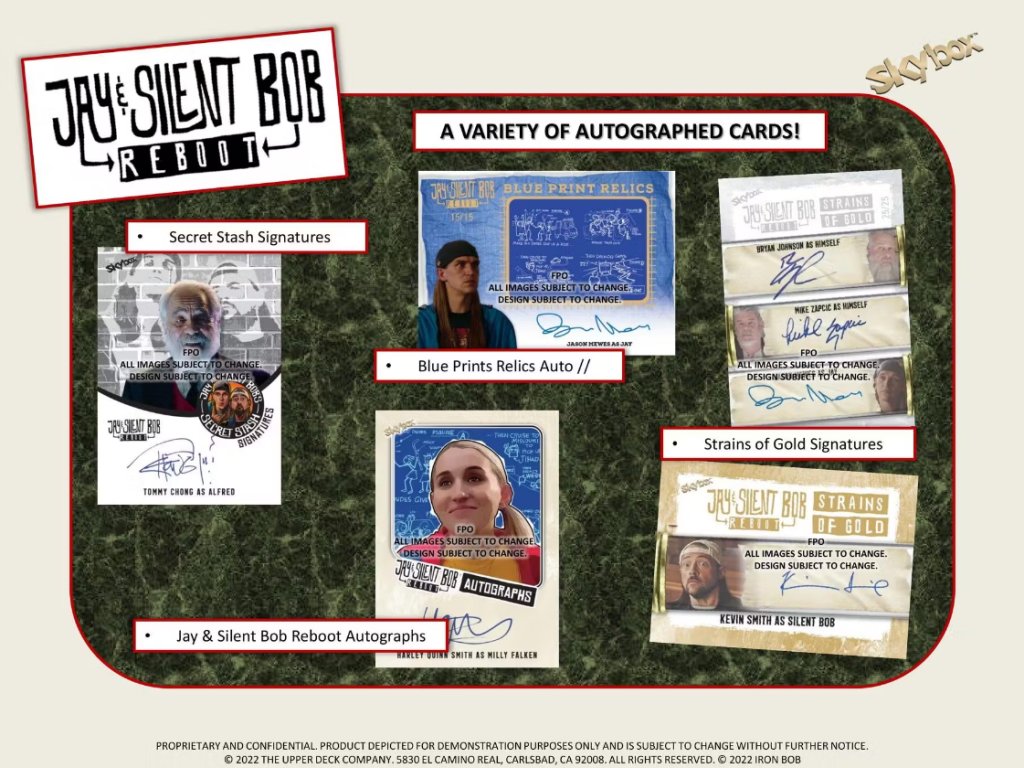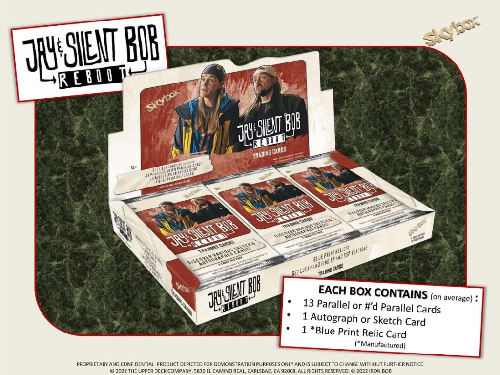 Jay & Silent Bob Reboot Hobby Booster Pack (Upper Deck 2023) ponúka fanúšikom kultovej komédie možnosť získať jedinečné zberateľské karty z tejto ikonickej filmovej série. Každý balíček obsahuje 5 kariet, ktoré môžu zahŕňať základné karty, paralelné varianty či špeciálne vložky. Medzi nimi patria autogramové karty hercov, originálne sketch karty a zaujímavé relic karty s filmovou tematikou.