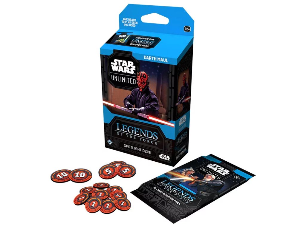 Spotlight Deck – Darth Maul z edície Legends of the Force vás stavia do úlohy Sithského bojovníka, pripraveného na rýchly súboj. Produkt obsahuje 50-kariet v hotovom balíčku vrátane líderskej a základnej karty, 3 obojstranné token karty, 11 zranení a 1 booster pack na rozšírenie vašej zbierky.