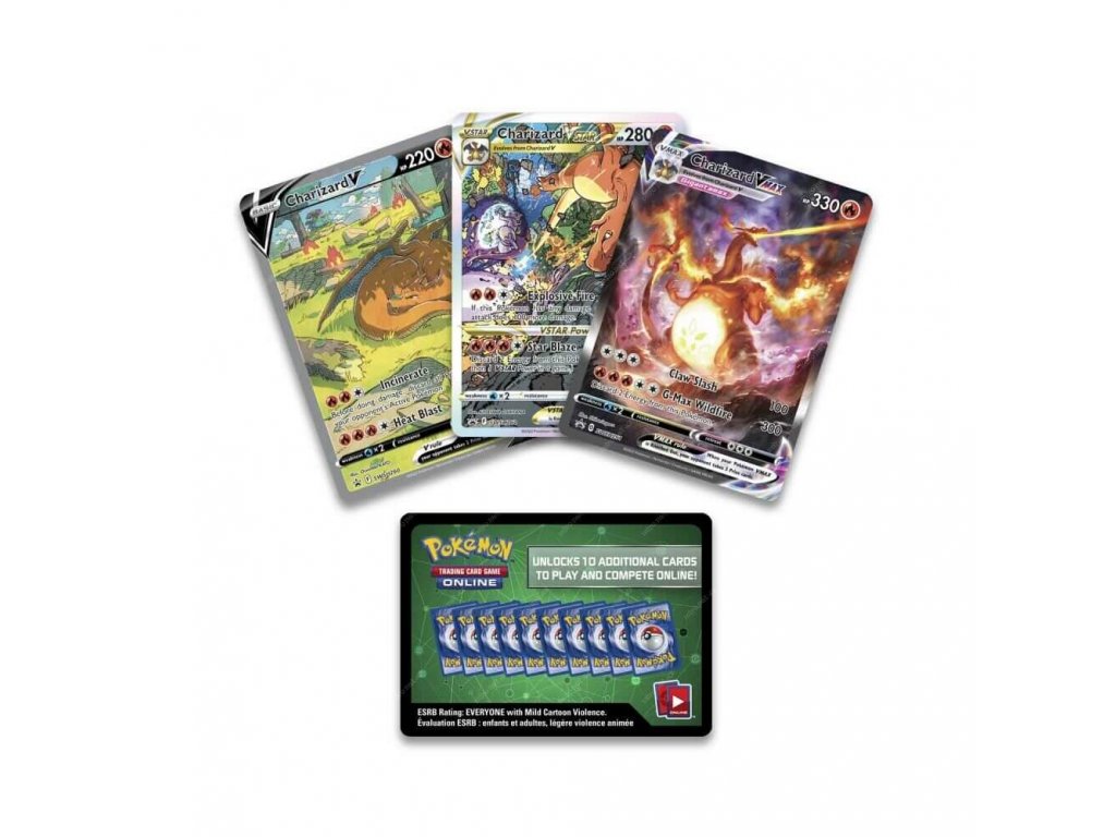 - 3 promo karty s Charizardom V, Charizardom VMAX a Charizardom VSTAR s etched foil efektom