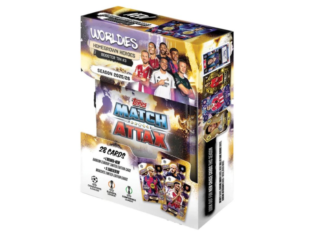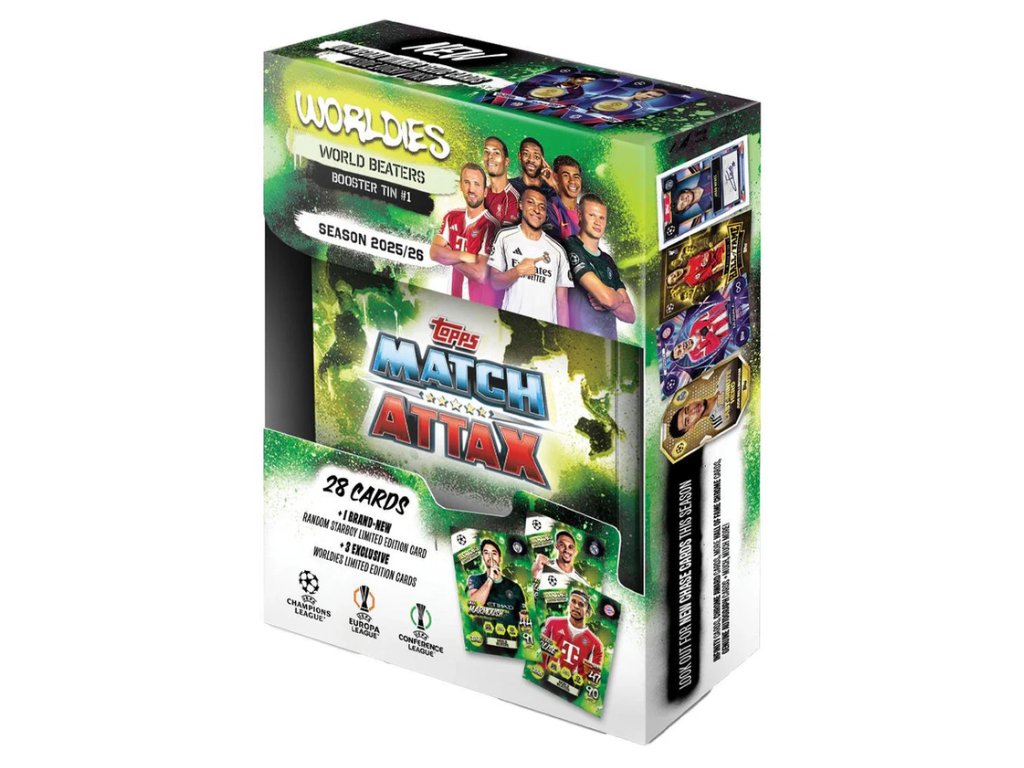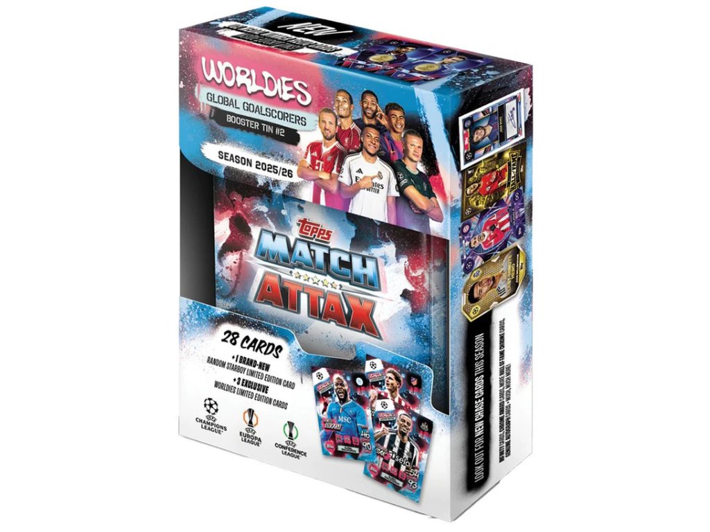 2025/26 Mini Tin od Topps Match Attax predstavuje kompaktnejšiu variantu tin produktov pre túto sezónu. Každá mini krabička obsahuje 32 kariet, ktoré môžu zahrňovať základné (base) karty, paralely či insert edície. V rámci tin edícií sa nachádzajú aj 3 exkluzívne Worldies LE karty, ktoré nevychádzajú v bežných packoch, čo zvyšuje ich zberateľskú hodnotu.