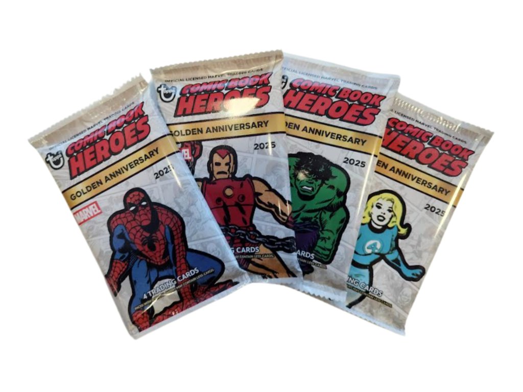 Marvel Comic Book Heroes 1975 Golden Anniversary Booster Pack obsahuje 4 karty zo série, ktorá spája retro štýl z rokov 1975/76 s moderným Chrome dizajnom.