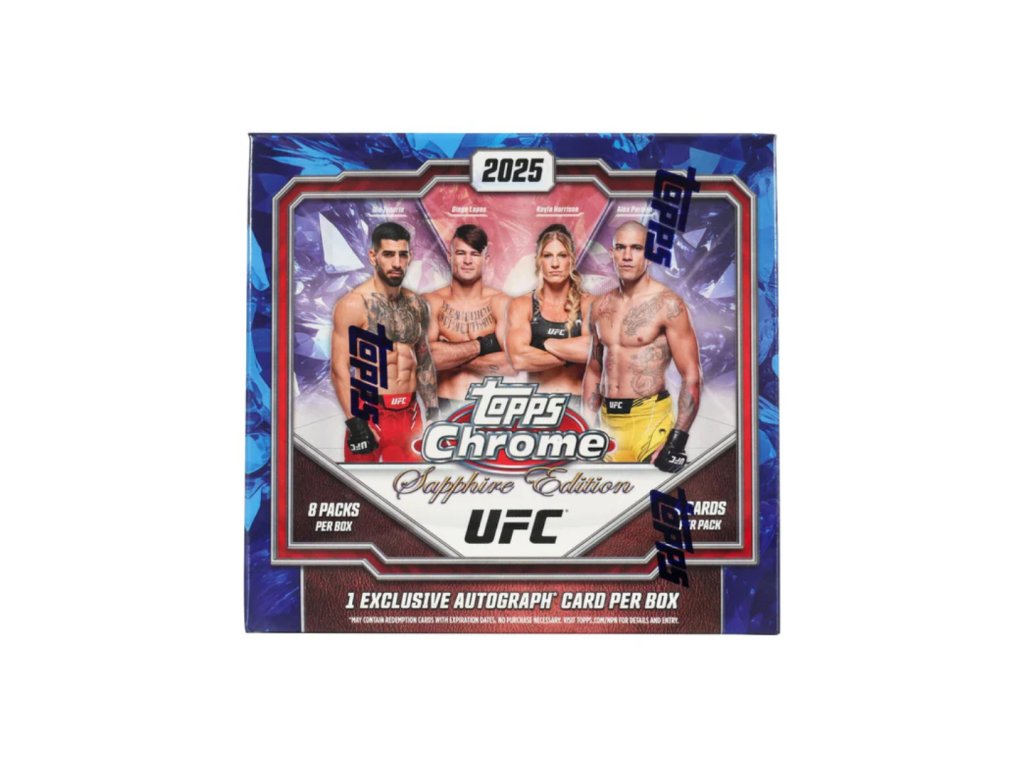 2025 Topps Chrome UFC Sapphire Edition Hobby Box je prémiový zberateľský box z limitovanej série Topps Chrome Sapphire venovanej MMA a UFC. Každý box obsahuje 8 balíčkov po 4 kartách a garantuje 1 autogramovú kartu s možnosťou ultra‑vzácnych variantov. Obsahuje exkluzívne Sapphire paralely a špeciálny insert Sapphire Selections, ktoré zvyšujú vzrušenie z otvárania.